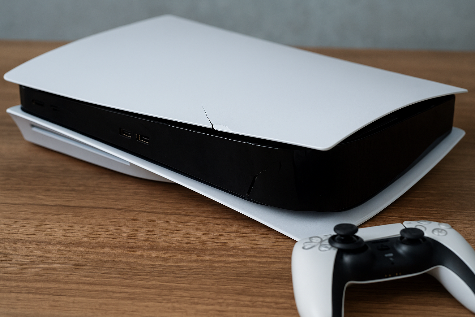 - pęknięta obudowa – szczególnie w PS4 i PS5 z charakterystycznymi panelami bocznymi,